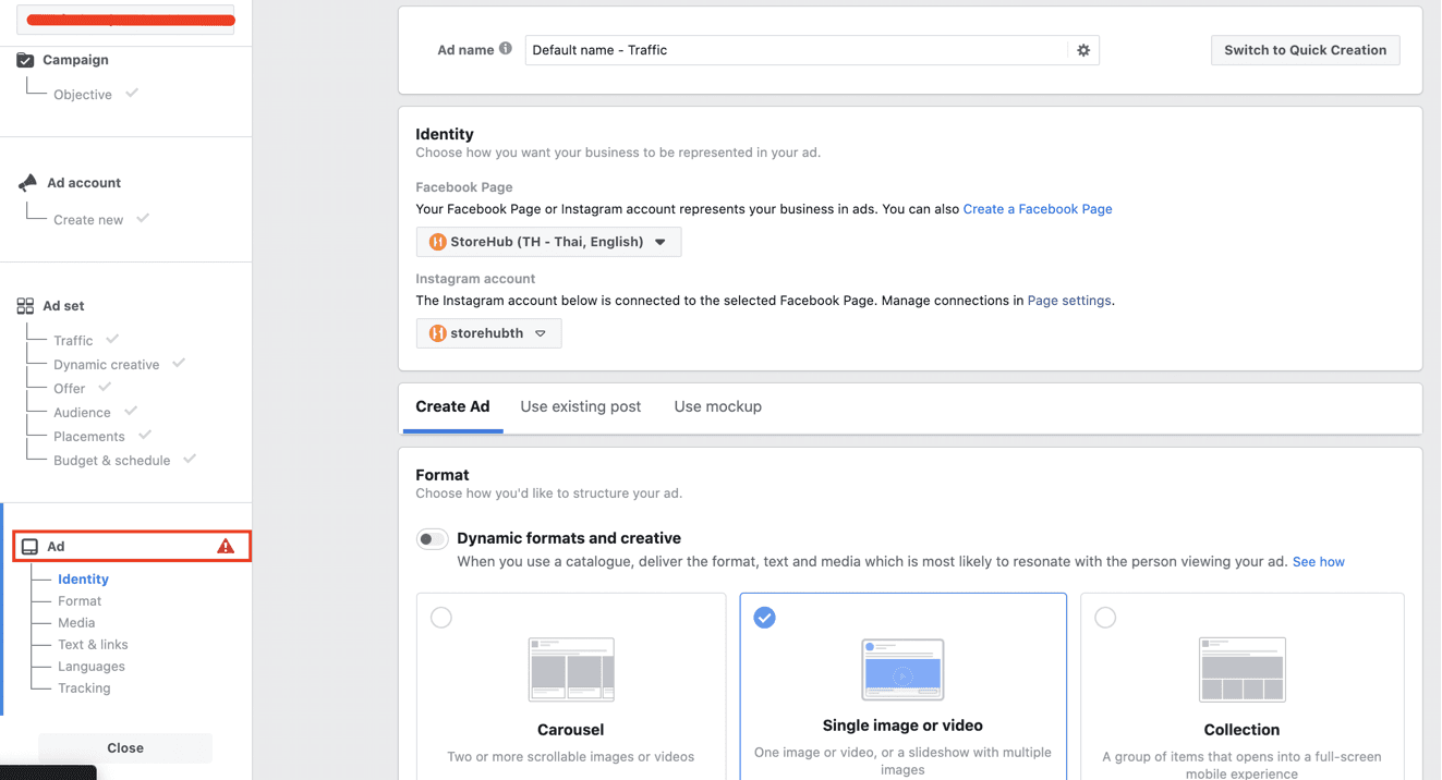 When creating ads, there are 3 main tabs to focus on.
