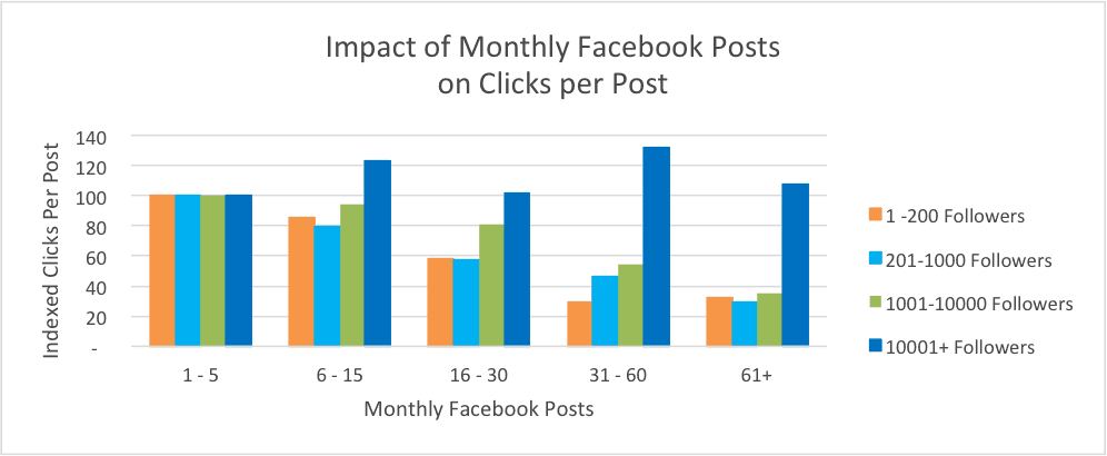 Pages with over 10,000 followers were the only ones for whom posting more often increased the number of clicks per post. For business Pages with 10,001+ followers, clicks per post peaked at between 31 - 60 posts per month. Companies with less than 10,000 followers that post more than 60 times a month receive 60% fewer clicks per post than those companies that post 5 or fewer times a month.