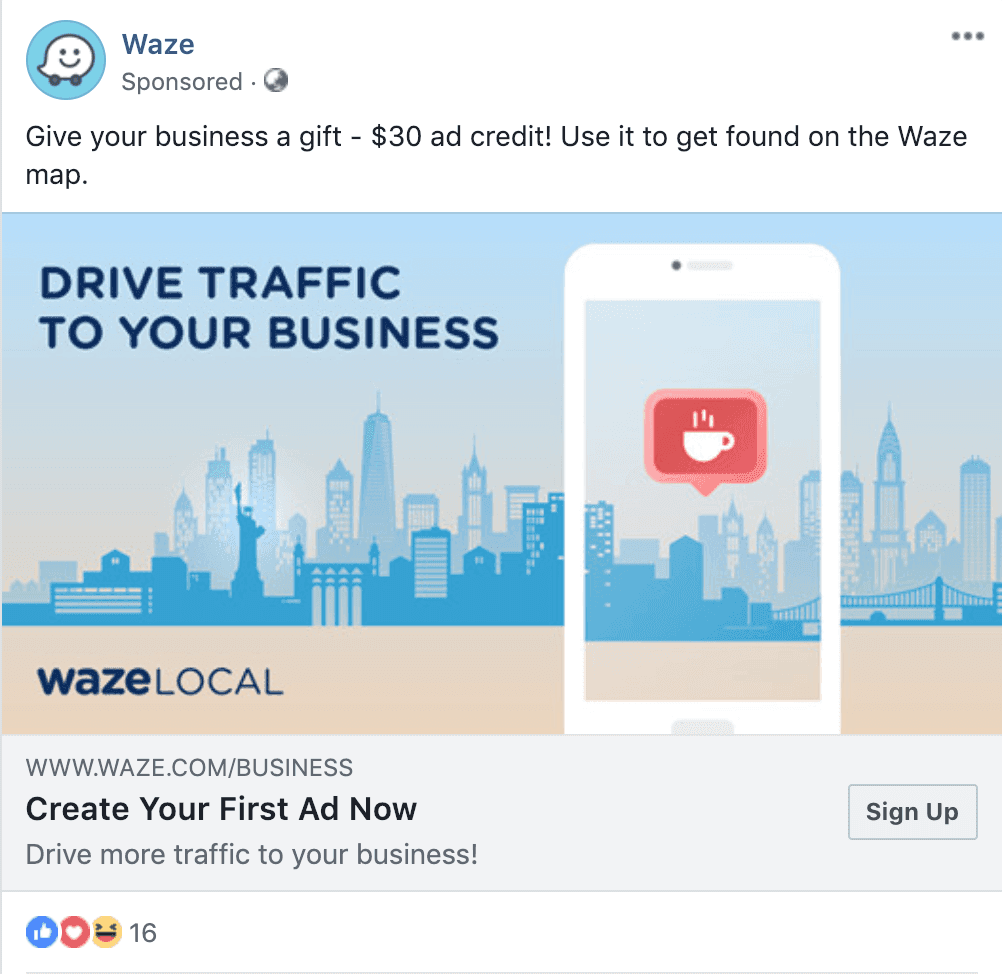 In Facebook, there are many different objectives - to gain new followers, increase brand awareness, post engagement, video views, website clicks, and conversions. The screenshot above is an ad by Waze prompting businesses to sign up to advertise on their platform.