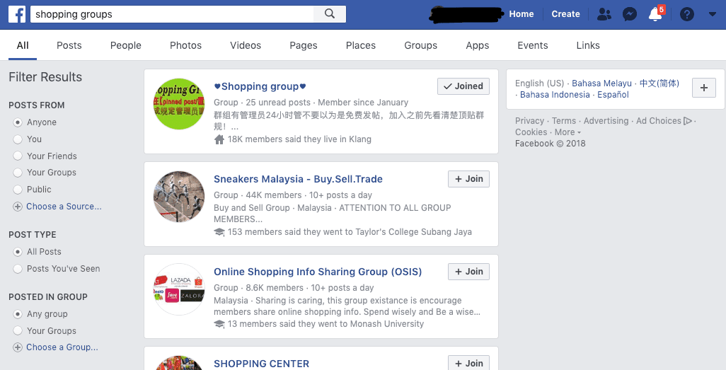 Think about your potential customers - what is their age group, hobby or interest? If they are new mothers, look for “mommy” or “baby” related groups and you’re sure to find a ton of Facebook groups to join.