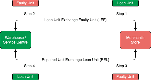 Loan Unit Exchange for Faulty Unit (LEF) – SH arranges for a loan unit to be delivered and installed for the merchant in exchange for the faulty unit, which will be sent for warranty repair.