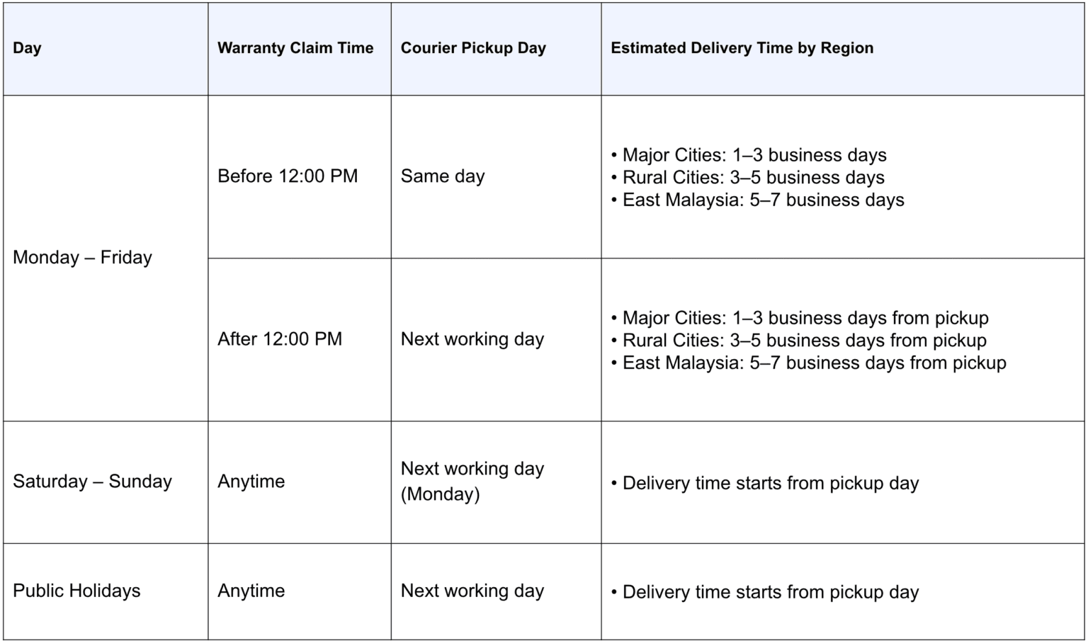 Same-day delivery is possible based on the time of claim and delivery method table below: