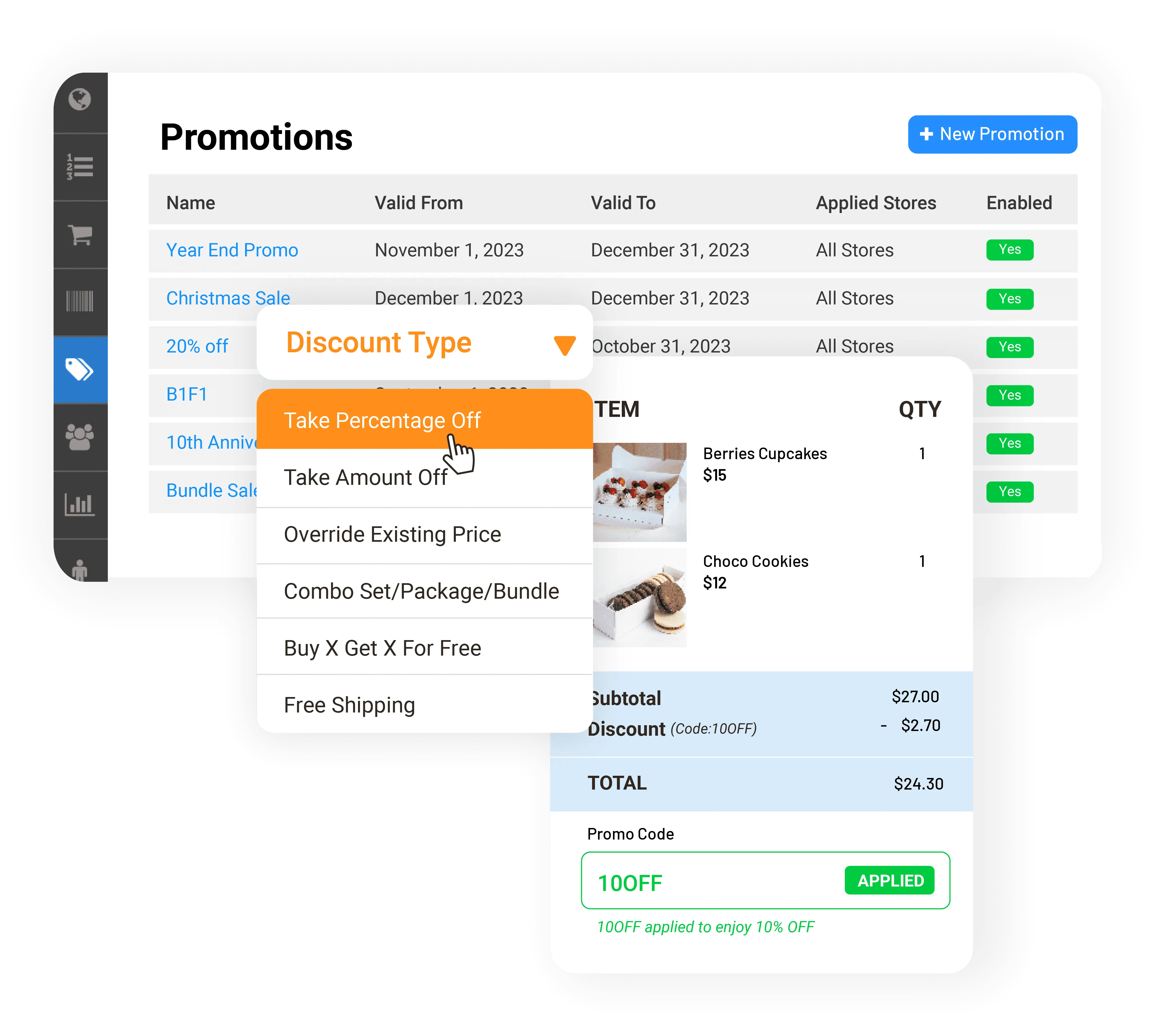 Choose from multiple promotion types – percentage off, bundles, free items, and more. Tailor mechanics to suit your sales goals.